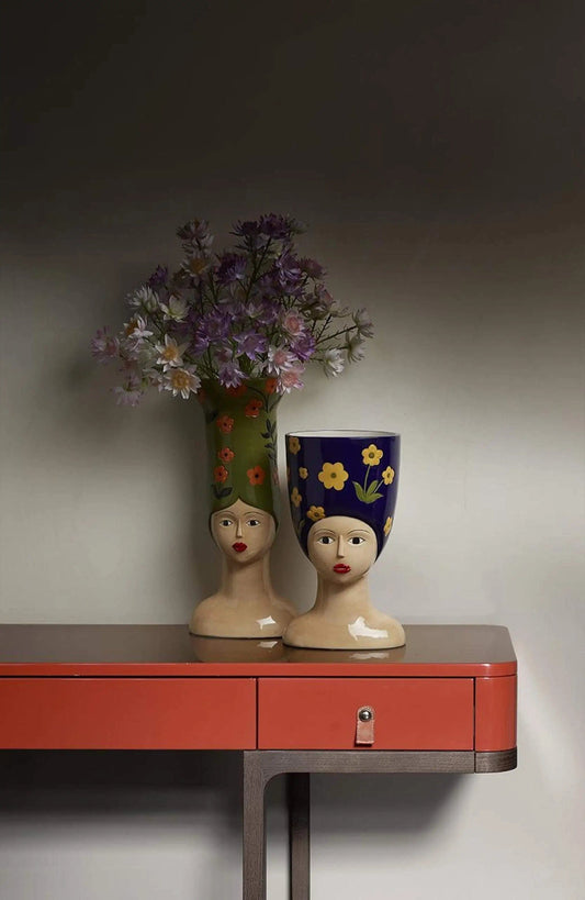 Decorative vase Italian woman with red hair - glazed ceramic H 8.7" Ø 5.9"