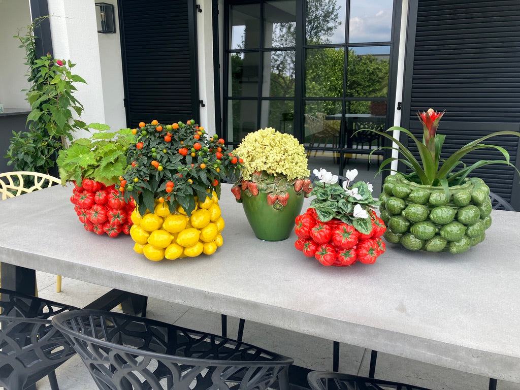 Italian designer vases made of glazed ceramic, completely covered with red, ripe tomatoes that also have green leaves, suitable for potted plants.